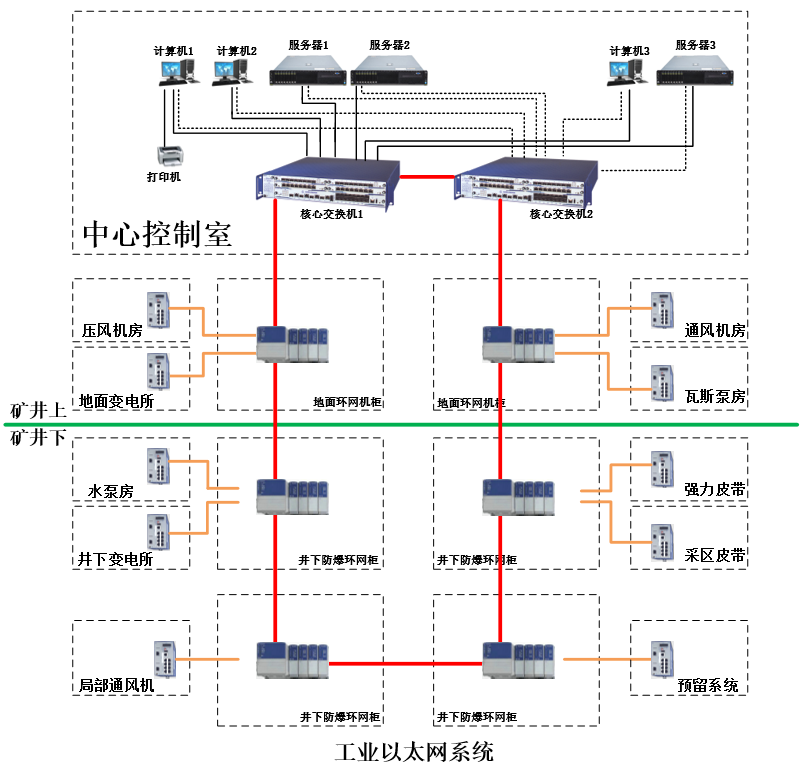 礦井工業(yè)以太網(wǎng)作為智慧礦山建設(shè)的重要組成部分,承擔(dān)著信息傳輸?shù)闹匾蝿?wù)。安全、可靠、快速的礦井工業(yè)以太環(huán)網(wǎng),能夠為礦井采掘、運輸、供電、通風(fēng)、壓風(fēng)、排水、提升、瓦斯抽采等自動化子系統(tǒng)以及視頻監(jiān)控系統(tǒng)提供一個完美的信息傳輸平臺,為礦井自動化、信息化建設(shè)提供網(wǎng)絡(luò)支撐。