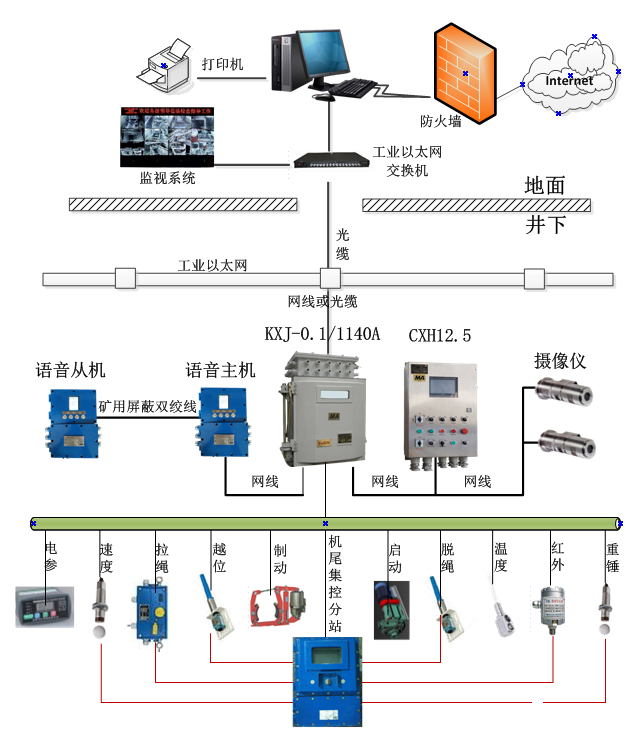 本控制系統主要由礦用PLC控制箱、甩道控制分站、保護傳感器、預警通話系統、視頻監控系統等組成。下圖 是整個系統的硬件組成圖