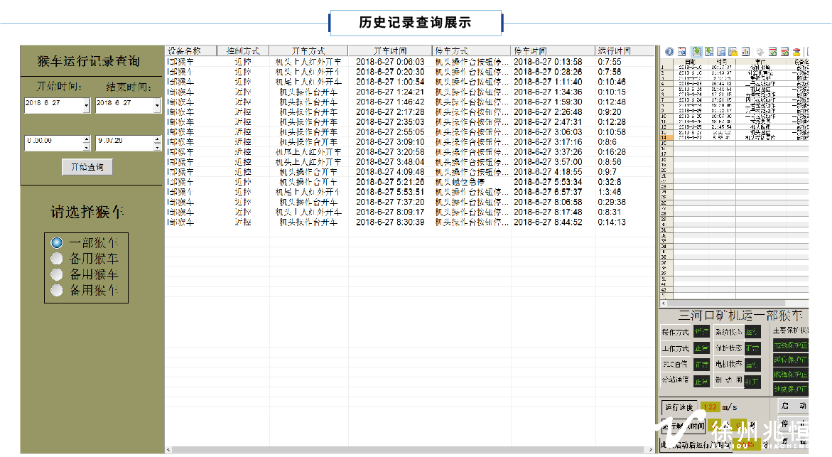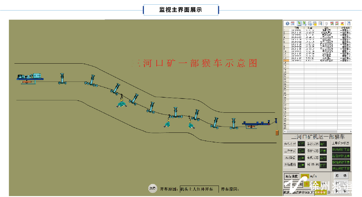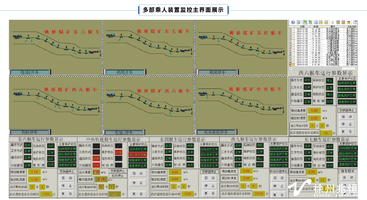 能夠通過地面計算機或井下就地箱上的顯示屏顯示架空乘人裝置的運行狀態(動態畫面);能夠顯示電動機或整個運行系統的主要參數(包括電機電流、運行速度、運行時間等參數);顯示保護傳感器動作的位置和故障信息等。